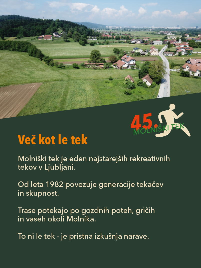Pridružite se nam na **45. Molniškem teku**, memorialu Milana Briclja, ki bo v **nedeljo, 17. maja 2026** v **Zadvoru, Ljubljana**. Tek bo potekal na čudovitih trasah po travnikih, gozdnih poteh in makadamu.
